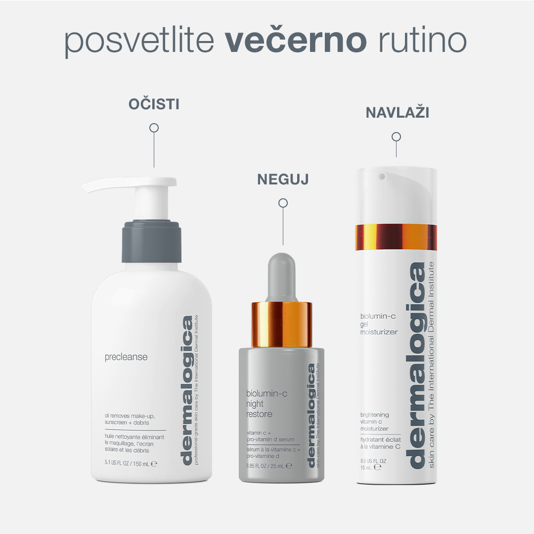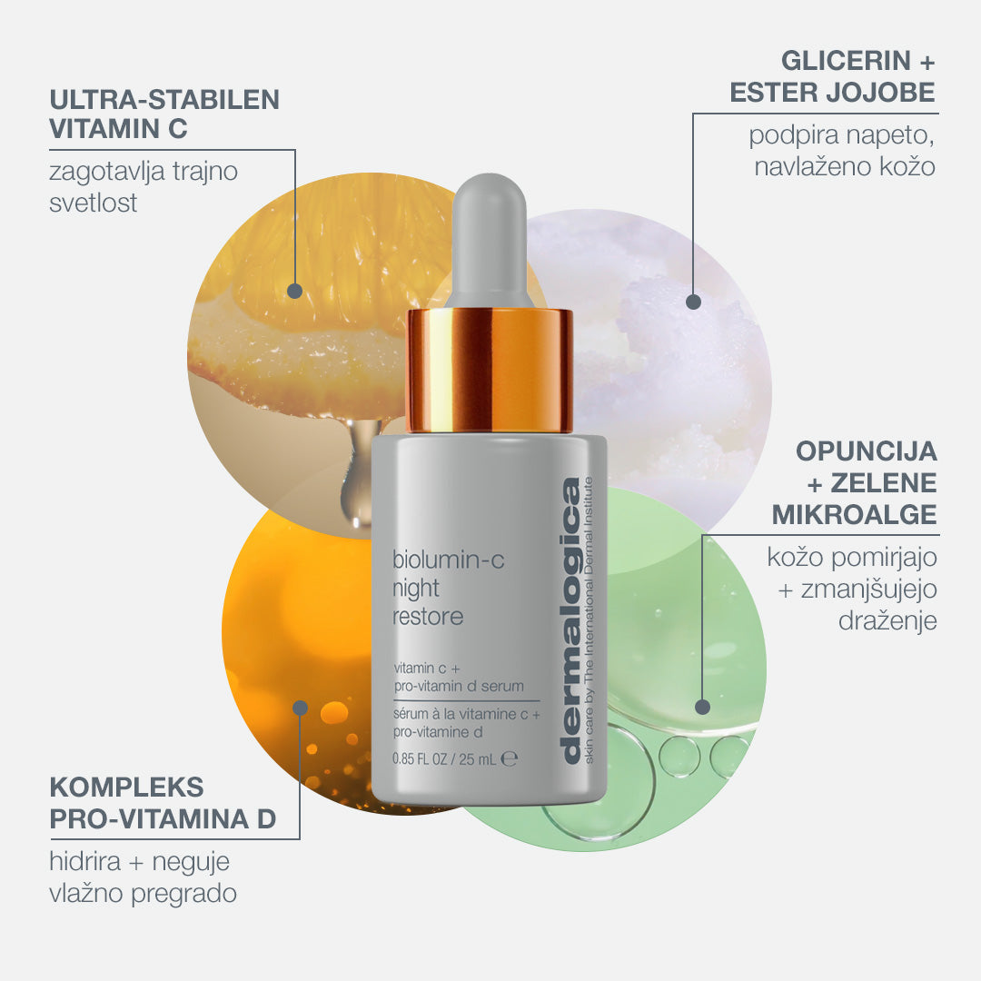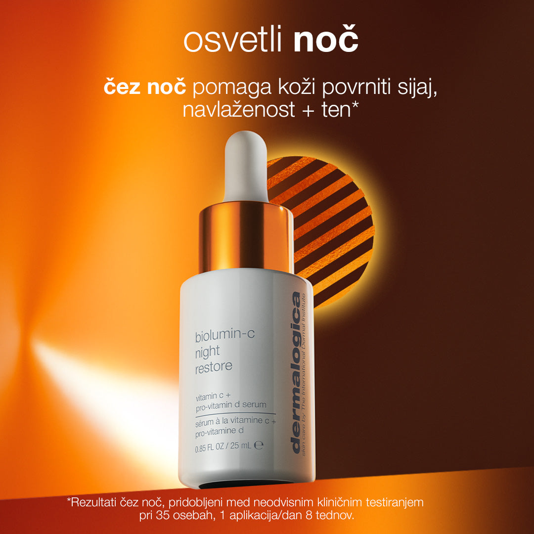 Ponoči naša koža vstopi v fazo regeneracije, ki si prizadeva popraviti dnevne poškodbe. Z našim izjemno stabilnim vitaminom C in hranljivim kompleksom provitamina D – Biolumin-C Night Restore pomaga obnoviti vlažilno bariero kože med spanjem, hkrati pa zagotavlja dolgotrajno svetlost in takojšnjo hidracijo. Rezultat se kaže v koži z več energije, ki je okrepljena za boj proti prihodnjemu oksidativnemu stresu.