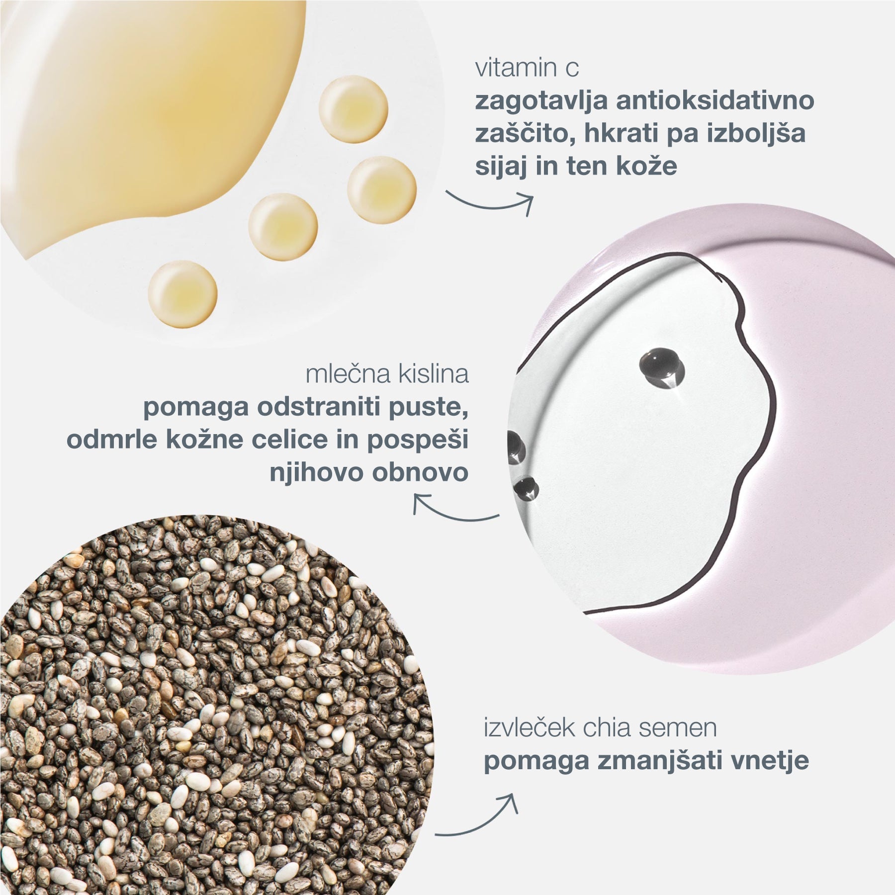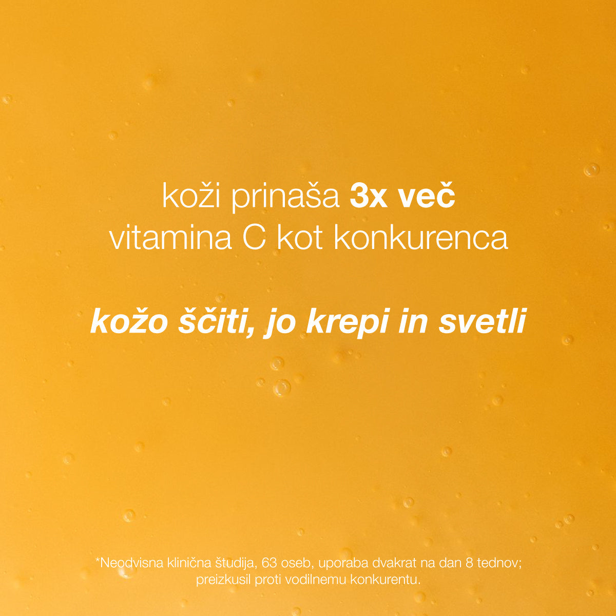 Učinkovit serum izboljša naravni obrambni sistem kože, hkrati posvetli, učvrsti in pripomore dramatično zmanjšati videz tankih gubic in gub. Napredna Biotehnologija in izjemno stabilen kompleks vitamina C delujeta sinergično za izboljšanje biološke uporabnosti vitamina C, ter pripomoreta zaščititi kožo pred oksidativnemu stresu in pojavu staranja kože, preden se le-to začne. Optimiziran sistem dovajanja v kombinaciji s peptidi in AHA kislinami poskrbijo, da koža postane svetlejša, čvrstejša in bolj sijoča.