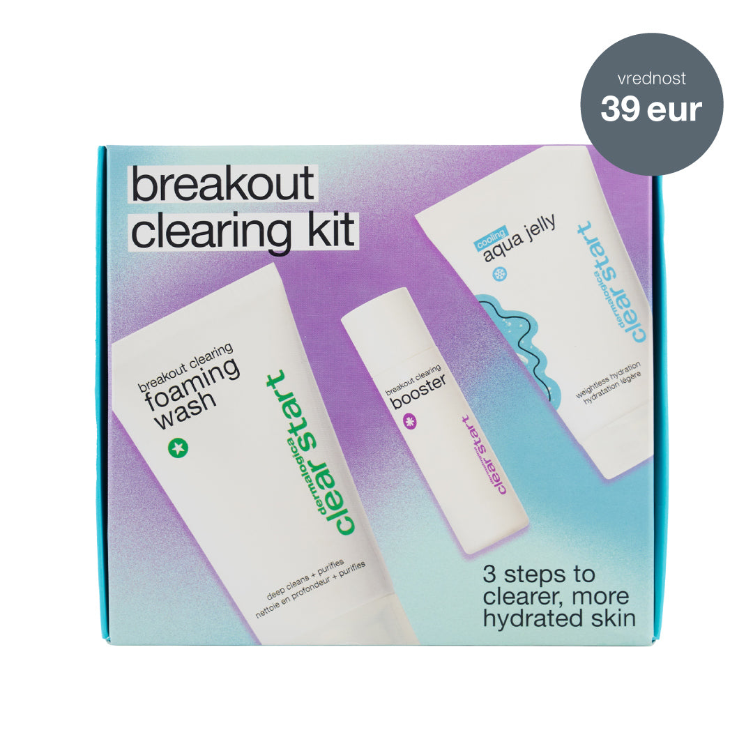 Set vključuje: breakout clearing foaming wash 75ml, cooling aqua jelly 25ml, breakout clearing booster 10ml.