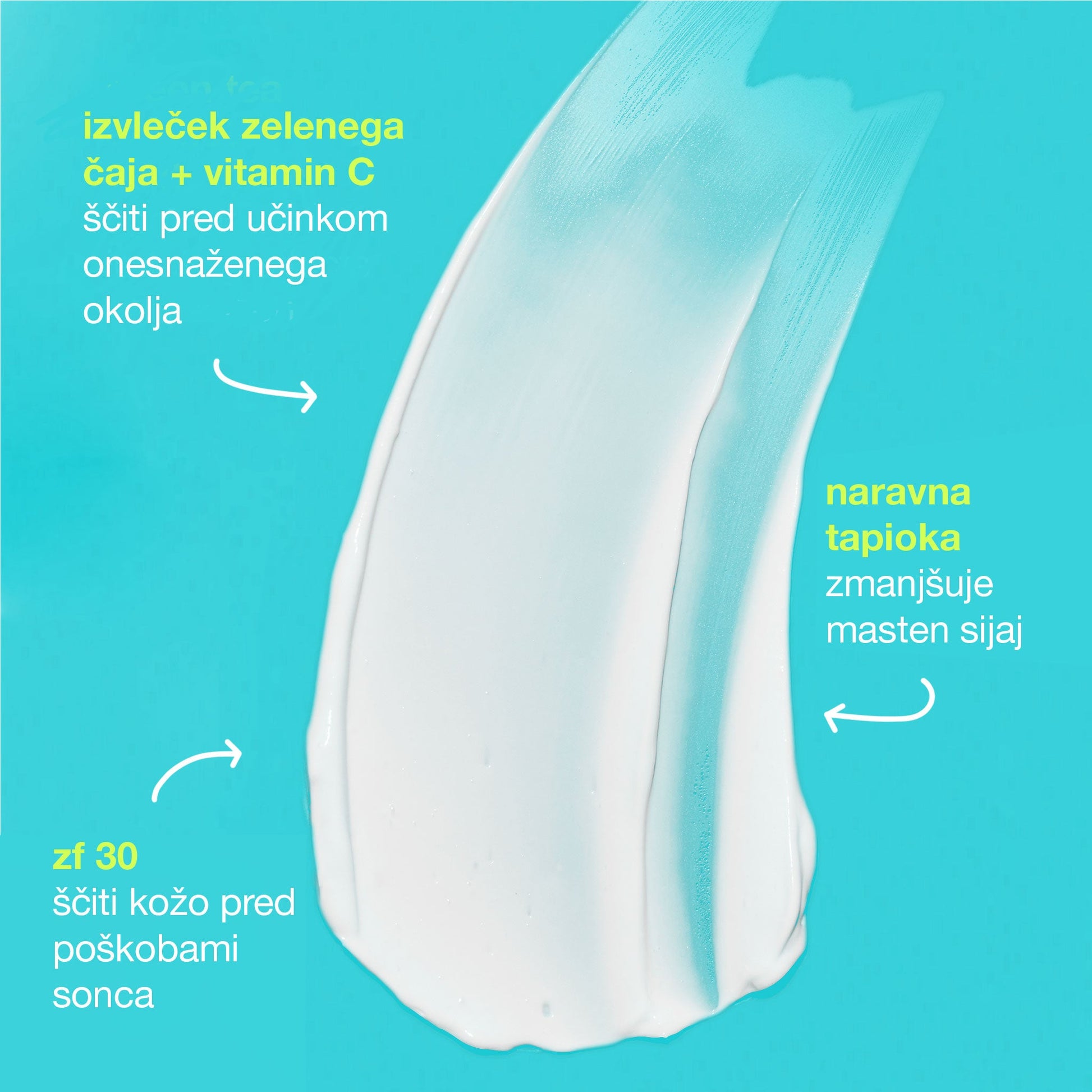 Zaščitna SPF krema zmanjšuje masten sijaj in ščiti k izpuščajem nagnjeno kožo pred okoljskimi dejavniki. Izjemno lahka formula zagotavlja dolgo obstojen mat videz kože, brez zamašitve por. Tehnologija TT deluje z naravnim mikrobiomom kože, medtem, ko naravna tapioka zmanjšuje masten sijaj. Antioksidantni izvleček lubja vrbe, izvleček zelenega čaja in vitamin C ščitijo pred dražečim učinkom, ki ji pušča onesnaženo okolje. Krema za sončenje širokega spektra ščiti pred UV žarki, ki lahko povzročijo neenakomere ten kože.