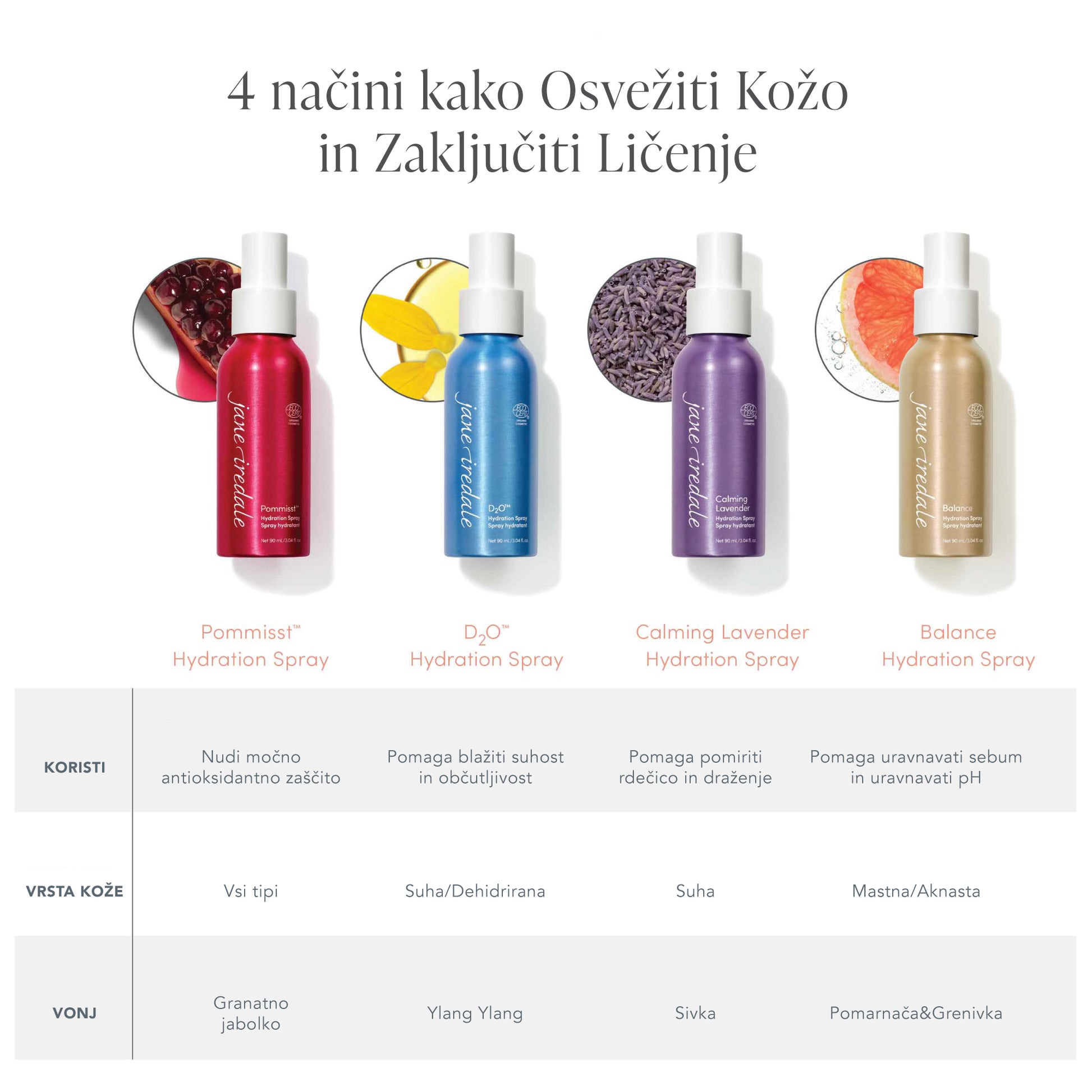 D₂O vlažilni sprej pomirja in ščiti tudi mešano kožo obraza ter stabilizira mineralna ličila. Popolnoma uravnava maščobo ter blaži suhost in rdečico obraza. Kožo neguje, make-up pa je dolgotrajen in obstojen. Namenjeno je vsem tipom in stanjem kože.