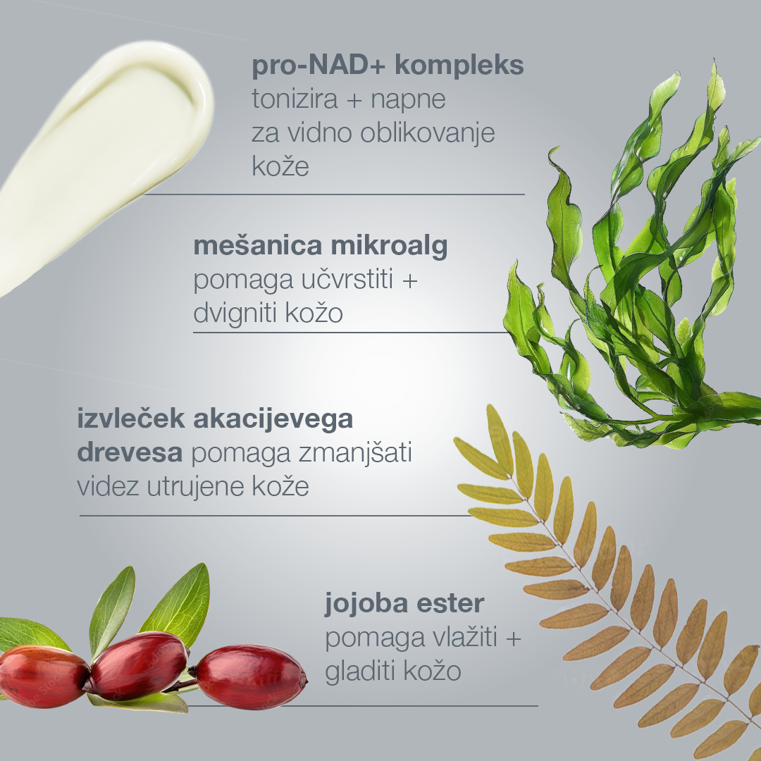 - Mešanica mikroalg in riževih beljakovin vidno učvrsti in navlaži kožo za bolj napet videz.