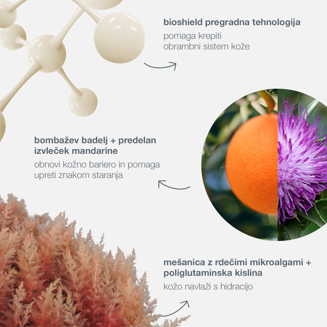 Ali se vaša koža prehitro stara? Negovalni multi – dinamični krepilni serum krepi odpornost kožne bariere za večjo vzdržljivost pred sprožilci staranja. Mlečni serum, ki ga poganja Bio – ščit uporablja biomimetične peptide, antioksidante in skvalan za pomoč pri krepitvi zaščitne pregrade. Izvleček iz zimzelena, odpornega na podnebne spremembe pomaga izboljšati obnavljanje kože za prenovljen videz. Bombažni badelj, ki obnavlja bariero in izvleček mandarine pomagata koži okrevanje in se upreti znakom staranja. Mešanica iz rdečih mikroalg hidrira in pripomore za prožnost kože zdravega videza, medtem ko izvlečki botanični listov tasmanskega popra in bisabolol kožo pomirjajo.