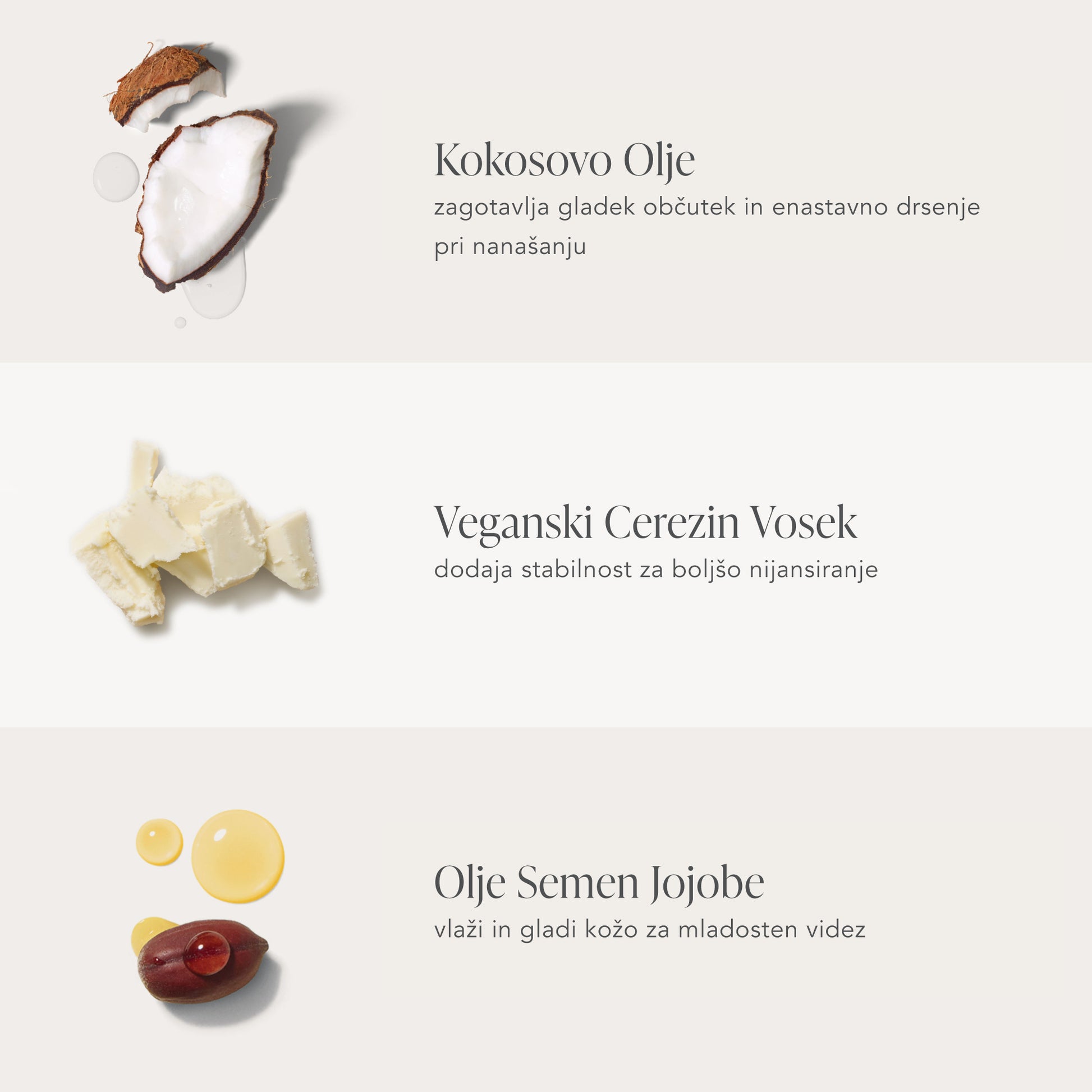 Kremasto, večnamensko rdečilo za lica, veke in ustnice v stiku, ki ga je mogoče mešati za zdrav in sijoč izgled.
