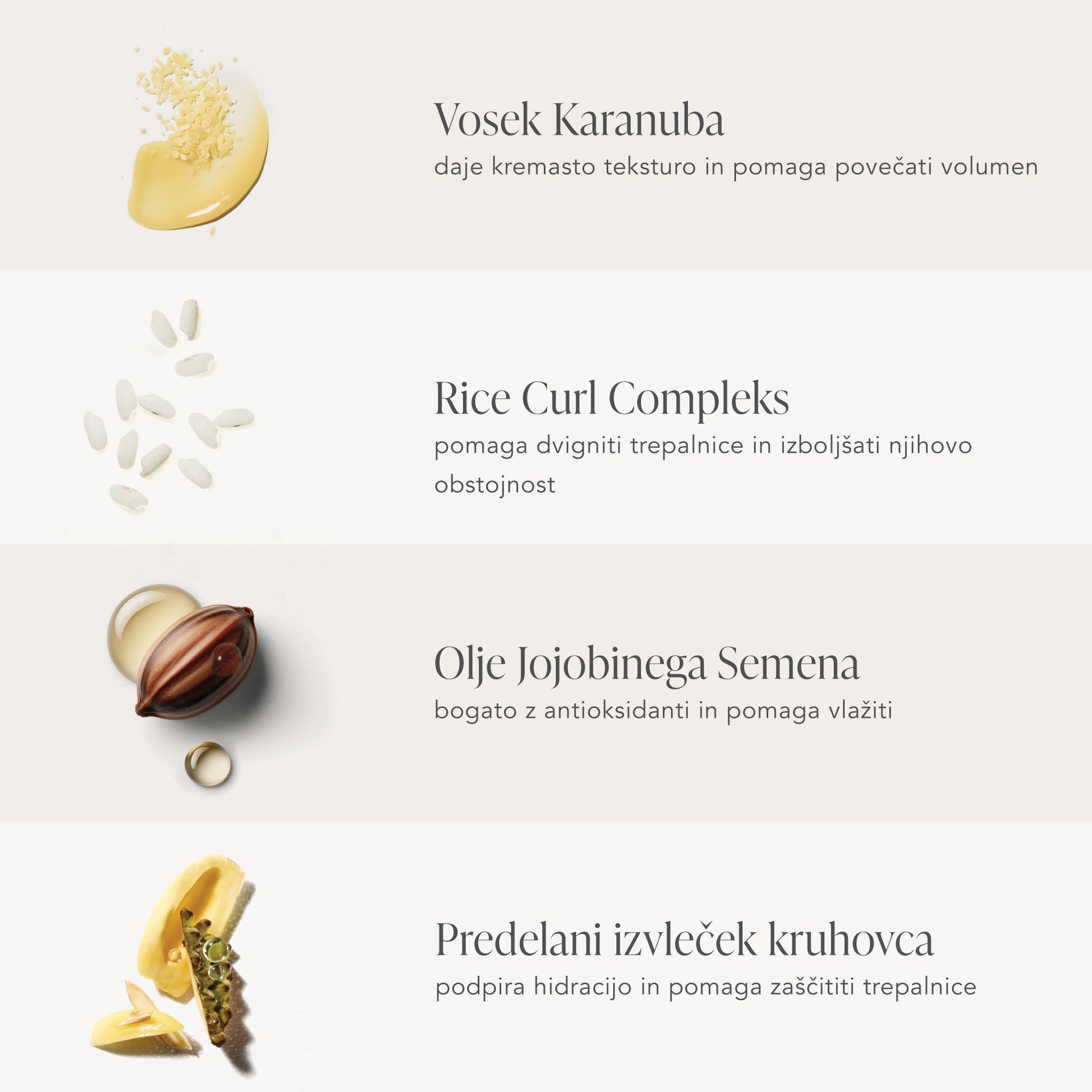 - Vosek Karanuba - daje kremasto teksturo in pomaga povečati volumen.