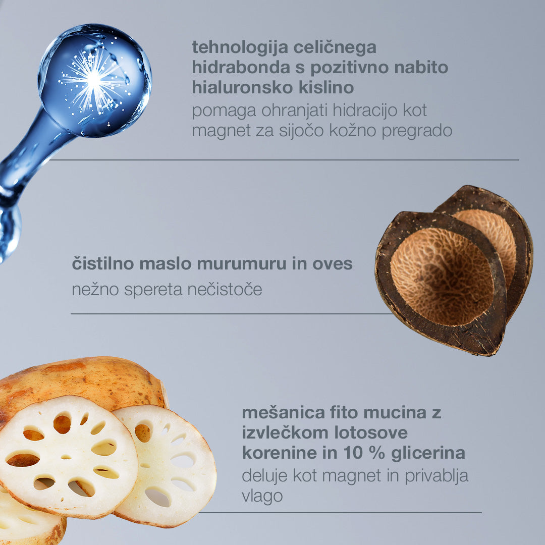 - Mešanica fito mucina z izvlečkom lotosove korenine in 10% glicerina deluje kot magnet, privablja vlago in optimizira vašo rutino nege kože.