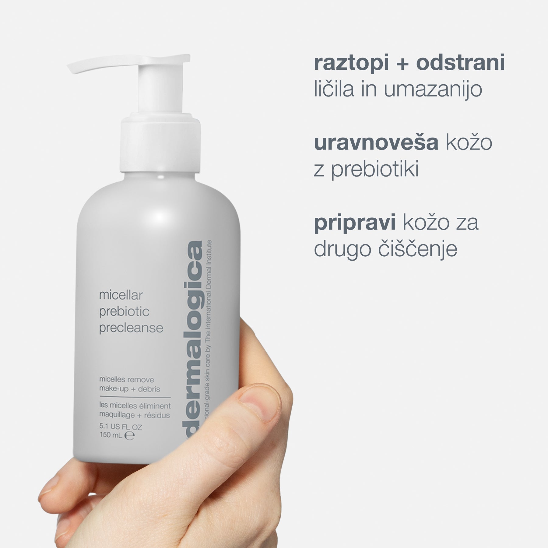 Hranljivo micelar-prebiotik mlečno predčistilo odstrani umazanijo, olja in ličila, ter s prebiotiki uravnoveša mikrobiom kože. Izboljša stanje, okrepi pregrado, poveča zmožnost kože, da zadrži več vlage in jo odlično pripravi za nadaljnjo nego.