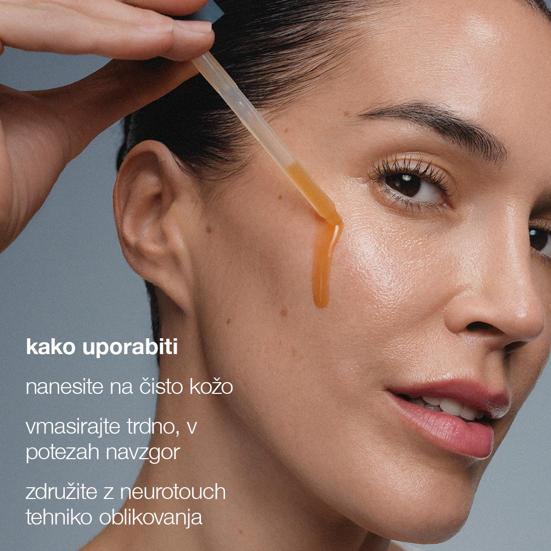 To lahko negovalno olje za obraz, ki ga poganja nevroznanost in človeški dotik, uporablja aktivne sestavine: adaptogene botanične izvlečke, biomimetični heksapeptid in koencim Q10 za vidno obnovitev simetrije obraza in bolj izklesan videz.