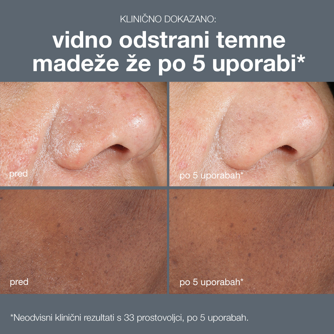 Že po 5. uporabi se vidno posvetlijo temni madeži. Piling za domačo uporabo vidno odstranjuje površinsko hiperpigmentacijo, vključno s temnimi madeži, ki jih povzročajo UV žarki in melazmo za širok spekter odtenkov kože.