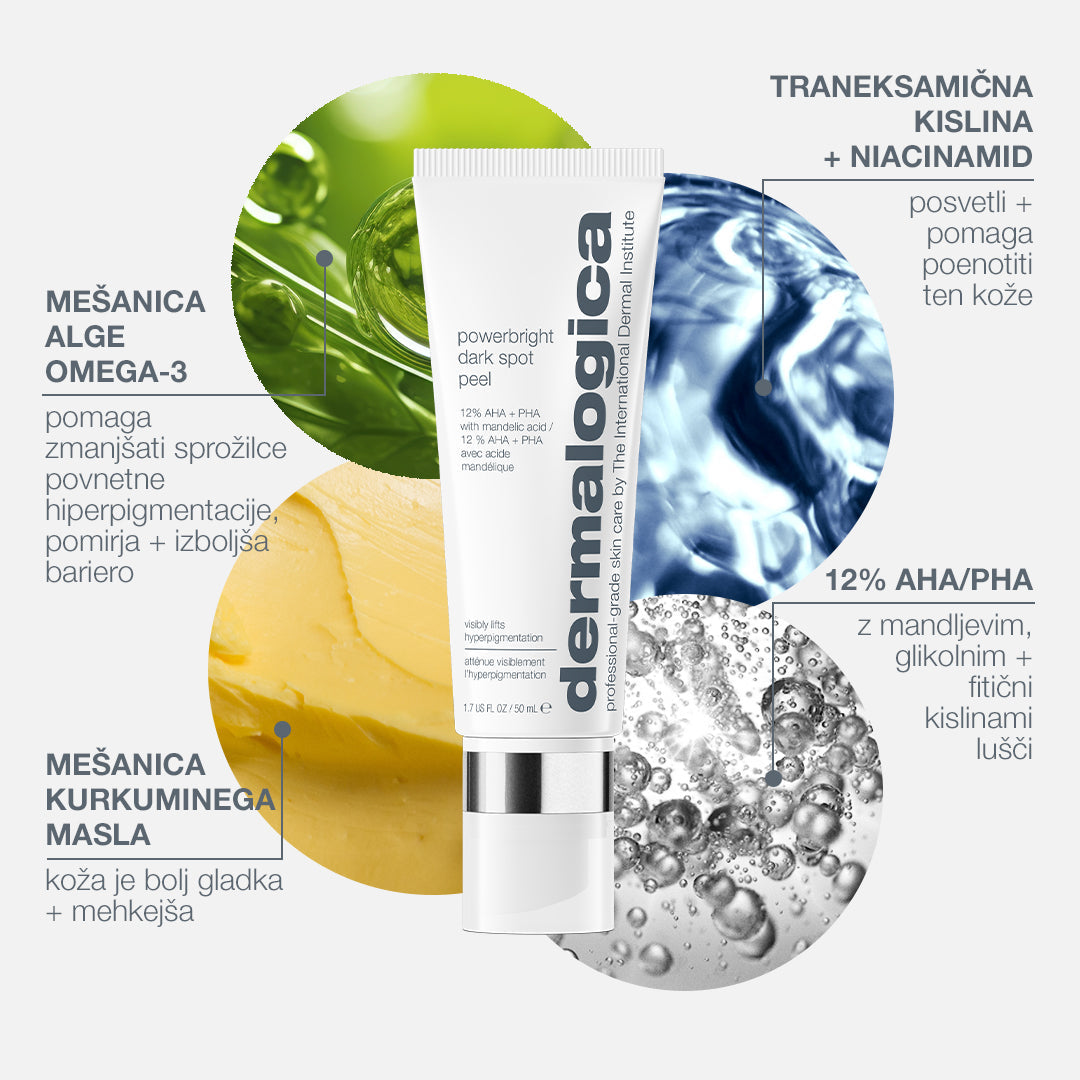 Ta hitro delujoča formula iz 12 % mešanice AHA in PHA, vključno z mandljevo kislino, hitro odstranjuje videz trdovratne hiperpigmentacije, medtem, ko traneksamična kislina in niacinamid pomagata poenotiti ten kože. Mešanica omega-3, ki je pridobljena iz alg obnavlja bariero kože, pomirja in zmanjšuje sprožilce, ki vodijo do povnetne hiperpigmentacije. Hranljiva formula, z antioksidanti bogata mešanica iz kurkuminega masla naredi kožo bolj gladko in mehkejšo.