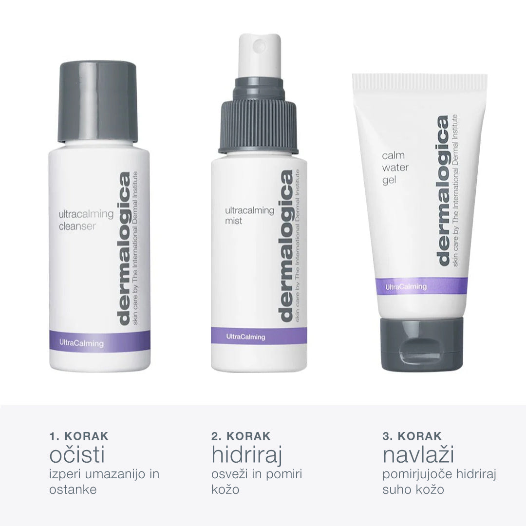 Ta močan trio pomirja, gladi, vlaži in pomaga zaščititi občutljivo kožo pred prihodnjimi izbruhi. Set vsebuje UltraCalming Cleanser 50 ml (nežna čistilna krema), UltraCalming Mist 50 ml (pomirjujoč, hladilni tonik) in Calm Water Gel 15 ml (breztežna vlažilna krema z vodnim gelom).
