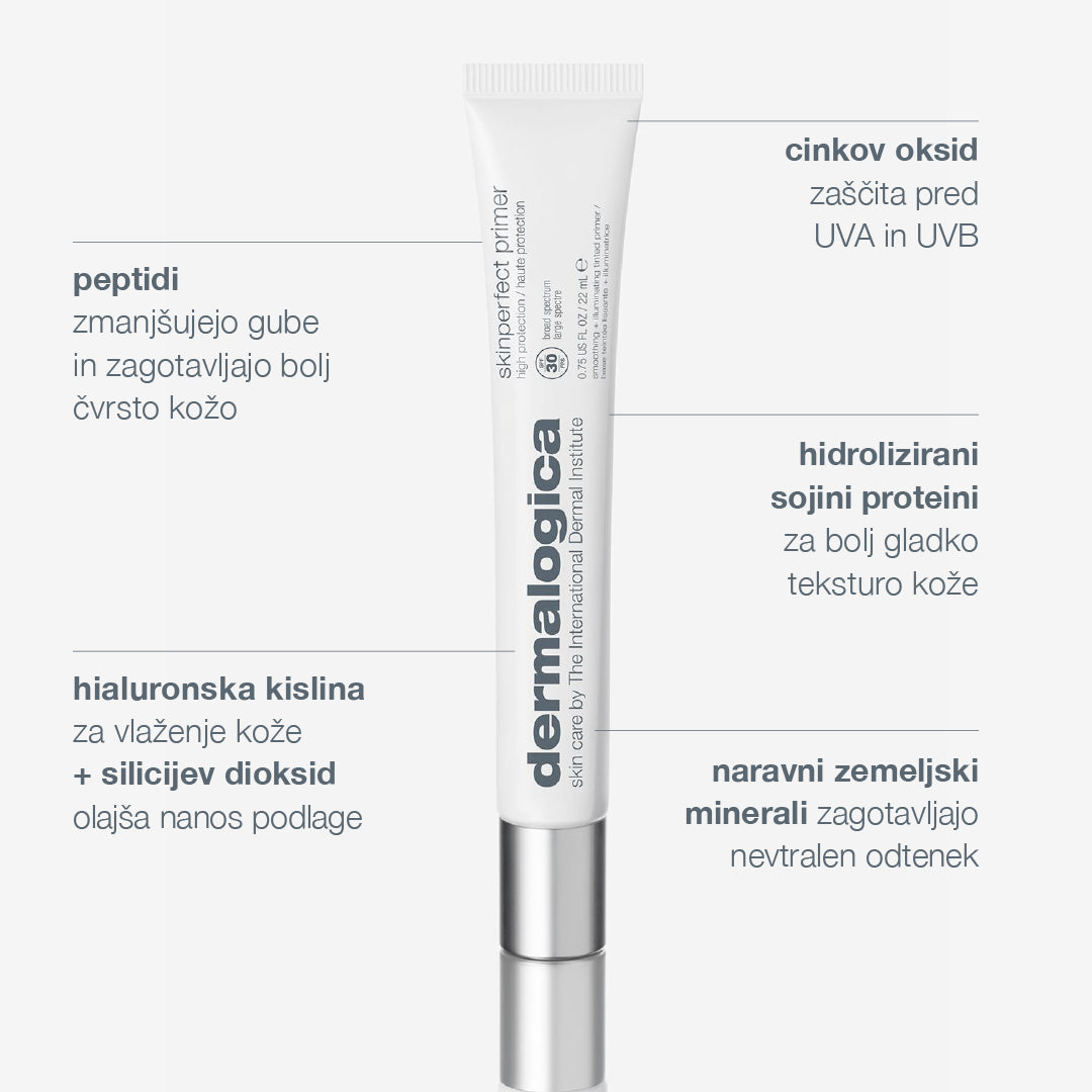 Zgladi drobne gubice, osvetli, daje lepši izgled ter jo pripravi za nanos ličil. Žametna formula s sojinimi beljakovinami pomaga izravnati teksturo kože ter ustvari bolj gladko površino. Močan peptid pomaga podpirati čvrstost kože. Sončna krema širokega spektra pomaga zaščititi pred poškodbami zaradi sonca,ki jih sproži UV svetloba. Prajmer nanesite po nanosu Dermalogica vlažilne kreme in pred pudrom, da zmanjšate videz tankih gubic za obstojen zaključek ličila.